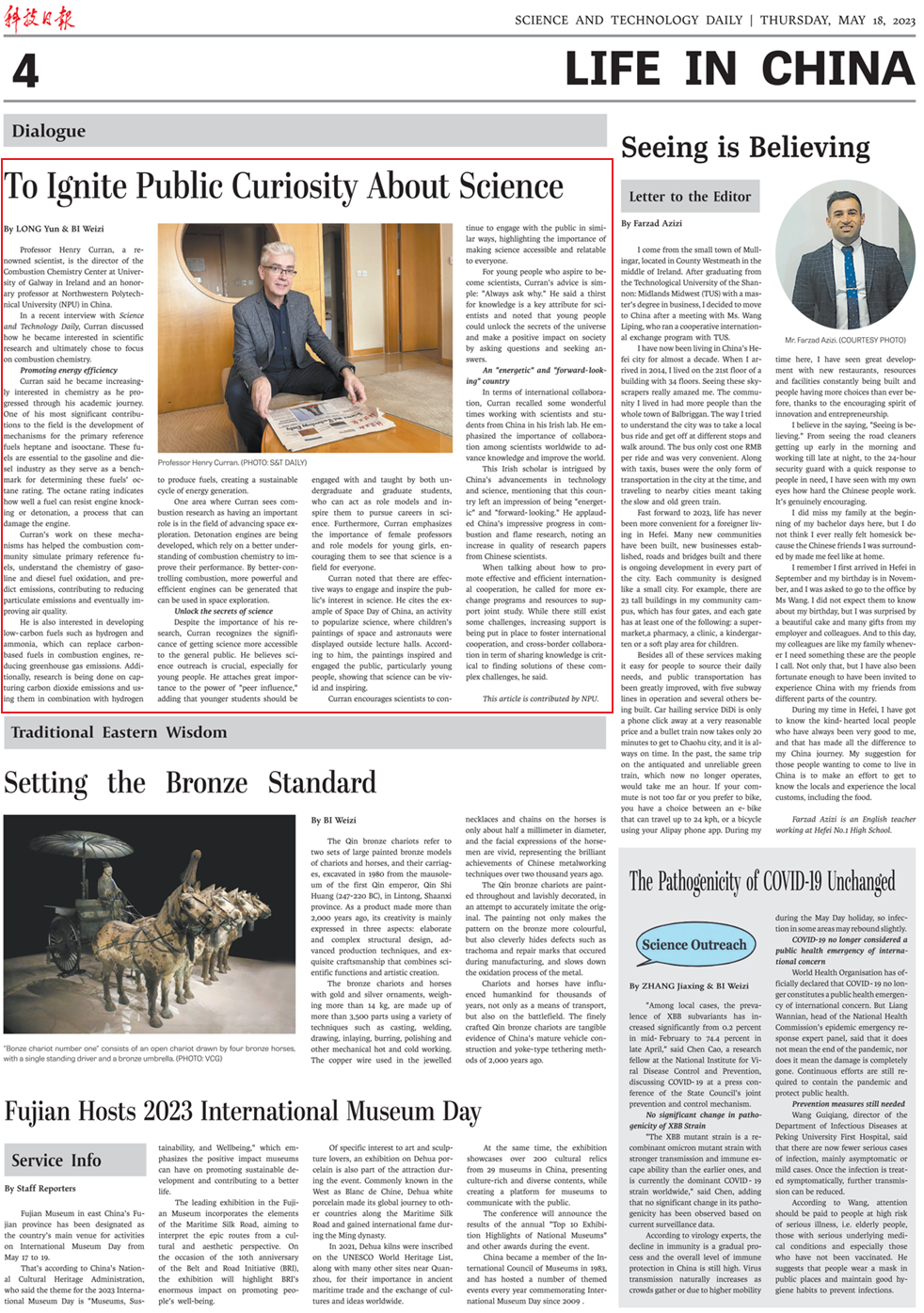 2023年,Henry Curran院士同我国长达15年的深度合作,被国家级媒体《科技日报》英文版长篇报道,题为:To Ignite Public Curiosity About Science(点燃大众对科学的探索欲)。